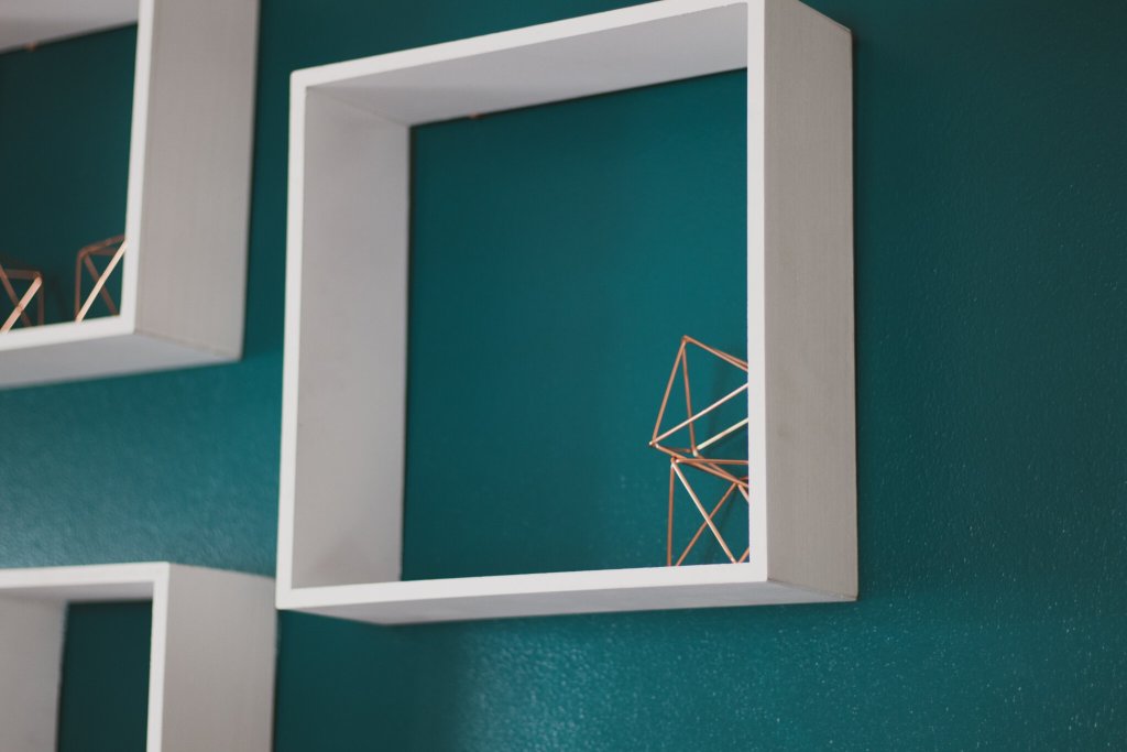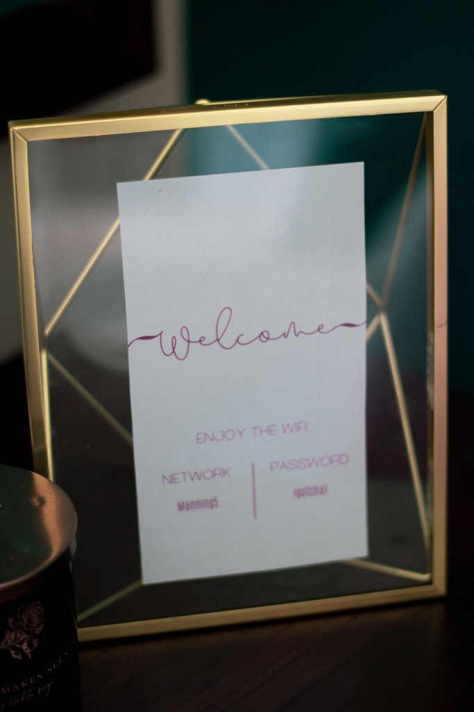 The final touches to the room came in the form of decor. They’re like the sprinkle of salt you put on a fresh baked chocolate chip cookie to elevate it and make the flavors pop. For decor pieces, I really wanted to bring in my mom’s decor style of a little global modern with pops of glam. I first started with replacing the lamp that was on the nightstand and removing the outdated radio. I got this really cool lamp from AllModern that is shadeless and has a big globe bulb and a copper neck. That brings just the touch of elegance to a really modern style lamp. It also takes up much less space, making it great for placing a glass of water or a phone when you’re in bed. It also looks amazing up against a painted wall and makes the wall color pop even more. Behind the bed, there are square shelves that hold a few trinkets that bring another layer of design to the painted wall. And the tv stand and nightstand bottom shelves hold books, candles and a vase that bring the global element into the room, in addition to the detailing on the legs of both pieces. The final element I picked up from AllModern is a beautiful brass picture frame that is a piece of art in itself. The design is a floating piece of glass in a well designed frame that brings geometric shapes into the design and plays off of one of the pillows on the bed. It holds a welcome sign with wifi information on the vanity and sits beside a teal tray that holds a little welcome arrangement of toiletries and a snack!