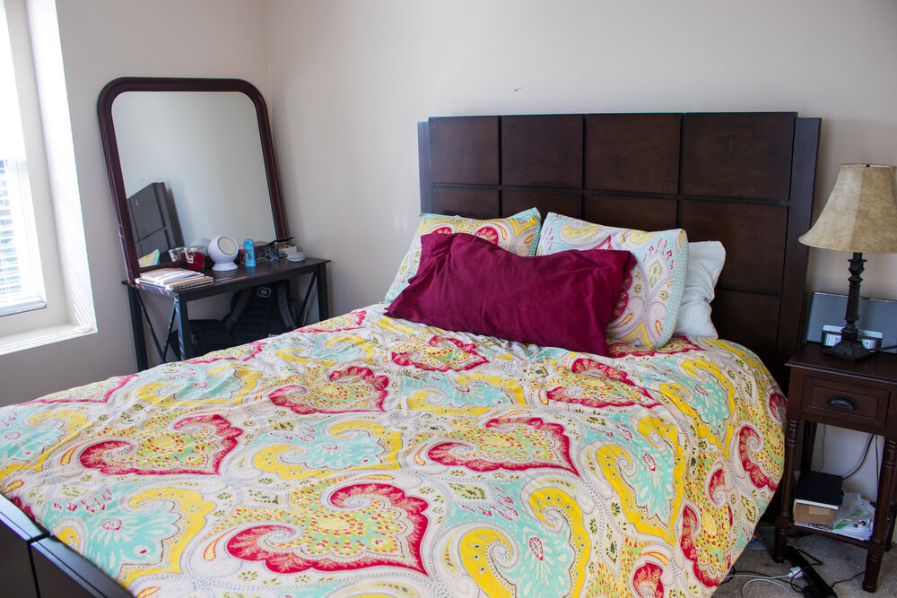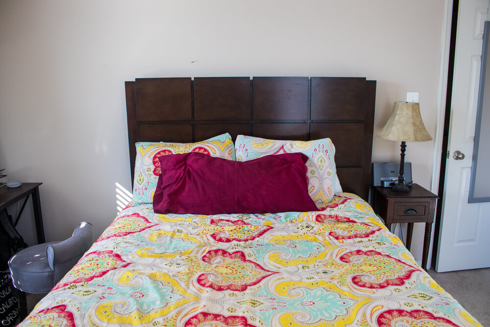 Ok, now into this guest room. I am so excited to show you all the reveal of this guest room. Before this redesign, the room was clunky and did not have much personality. While the bed spread was colorful, the furniture was a dark brown and the walls were a plain neutral. There wasn’t a design in the room, so it never felt like an intentional space. Instead, it felt cold and unwelcoming. The first thing I did to combat that was find inspiration in the rest of the house, which is well decorated and full of personality, and bring that into the room. I was led to a painting that had a lot of good colors to choose from. The color that stood out to me the most was teal and I immediately knew I wanted to paint the wall behind the bed one of the shades in the painting. I ended up going with Valspar’s “Gypsy Teal” which has a gorgeous tone and is richly saturated. It makes the entire room pop with personality as soon as you enter.