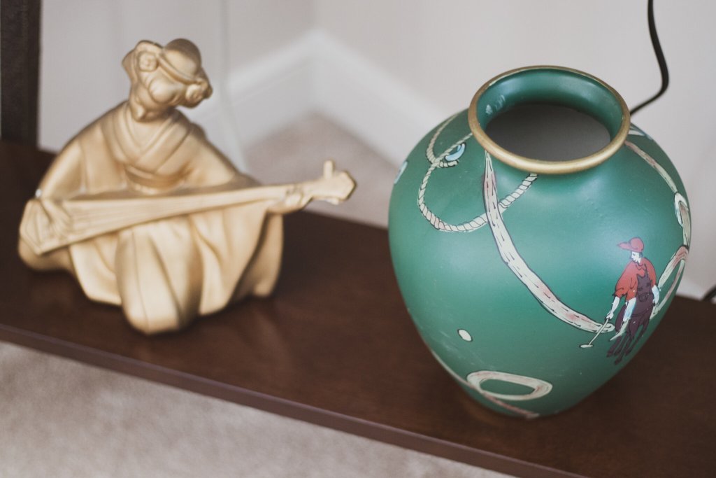 Moving away from the bed, my focus was the wall opposite the bed. Since it was not painted as the wall behind the bed was, I wanted to bring some color and life to it as well. After all, it’s the wall guests are most likely to be staring at while in bed. On this wall, I also have a big window that is just off center. Originally, I wanted to put a pull down shade in the window to bring color and texture, but as we are keeping it budget friendly, I left the blinds that were there. Instead, I decided to move the over-the-door mirror I already had from the door to the wall. I sprayed it to match the metallic accents in the room and it fit perfectly in space that was smaller beside the window. On the other side of the window, I brought in the painting that first inspired the design. I turned it sideways to fit long on the wall and it was just the pop of color I needed, and just the right size that I didn’t need anything else there.
