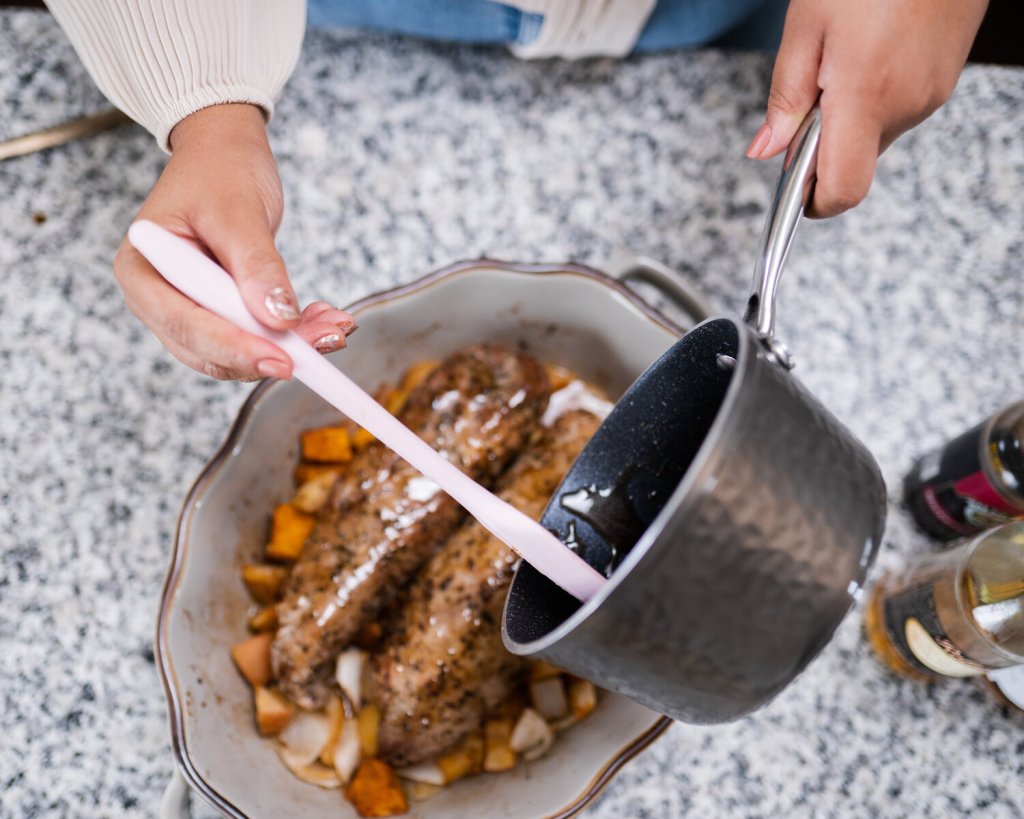 So this recipe is fairly simple. Because pork loin can either be great or terrible, with no in between, it’s important to build in as much flavor as possible before it goes into the oven. To do this, aggressively seasoning the outside and searing will make sure that the flavor is build up enough on the outside to be included in every bite! To further build up that flavor, we sear the outside. This builds up flavor through a chemical reaction called the Maillard reaction. I talk about this often, but what it is is a reaction between amino acids and reducing sugars so that you get a distinctive flavor of browned foods. This will ensure that even at roasting at a low temperature, we get a delicious flavor on our pork on all sides. The secret weapon of this dish, however, are the roasted veggies that sit underneath the pork. They get tender in the oven and serve as the starch component to the dish. The sweet potatoes, apples and onions play so well together, bringing together earthiness, sweetness and savoriness in one bite! To finish this off, the easiest glaze is made on the stove top and poured over when the pork comes out of the oven. It’s a well rounded bite that is so perfect for cold months and ready for dinner when you are! Now let’s get into the tips for making, so we can get this finished!